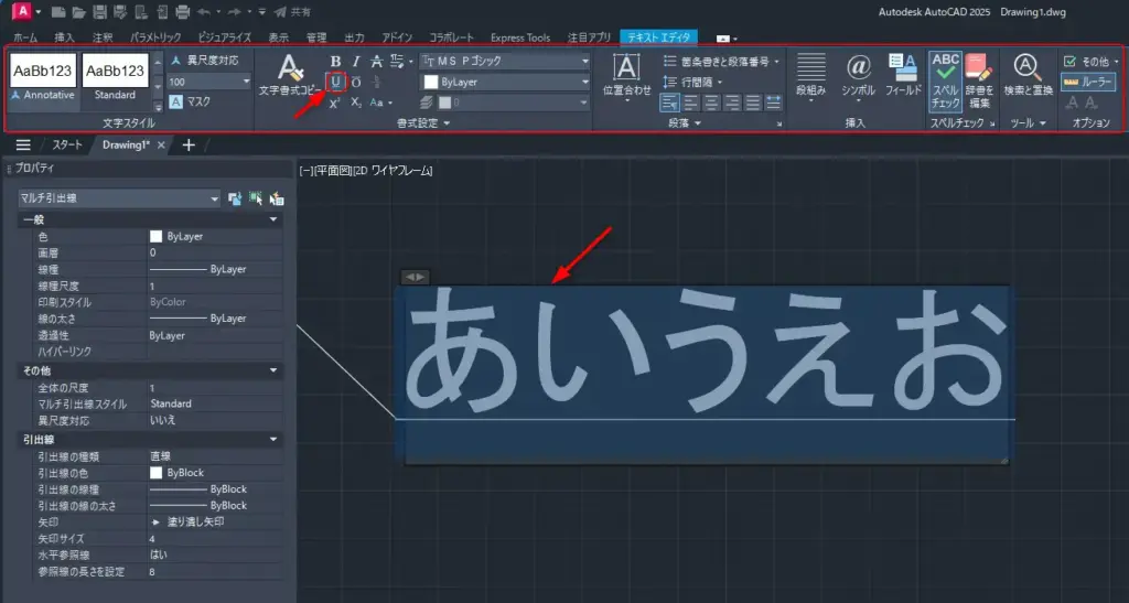 はい、autocad MTEXTについても、下線が二重になる原因は多くの場合、マルチ引出線と同じでテキストエディタ内の書式設定が重複表示されていることです。