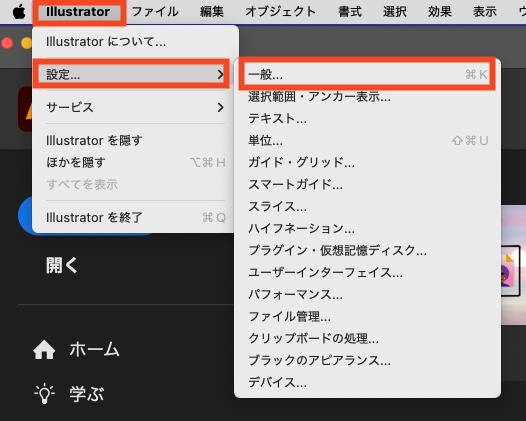 上部のメニューから、Illustrator→設定→一般を選ぶと環境設定が開きます。