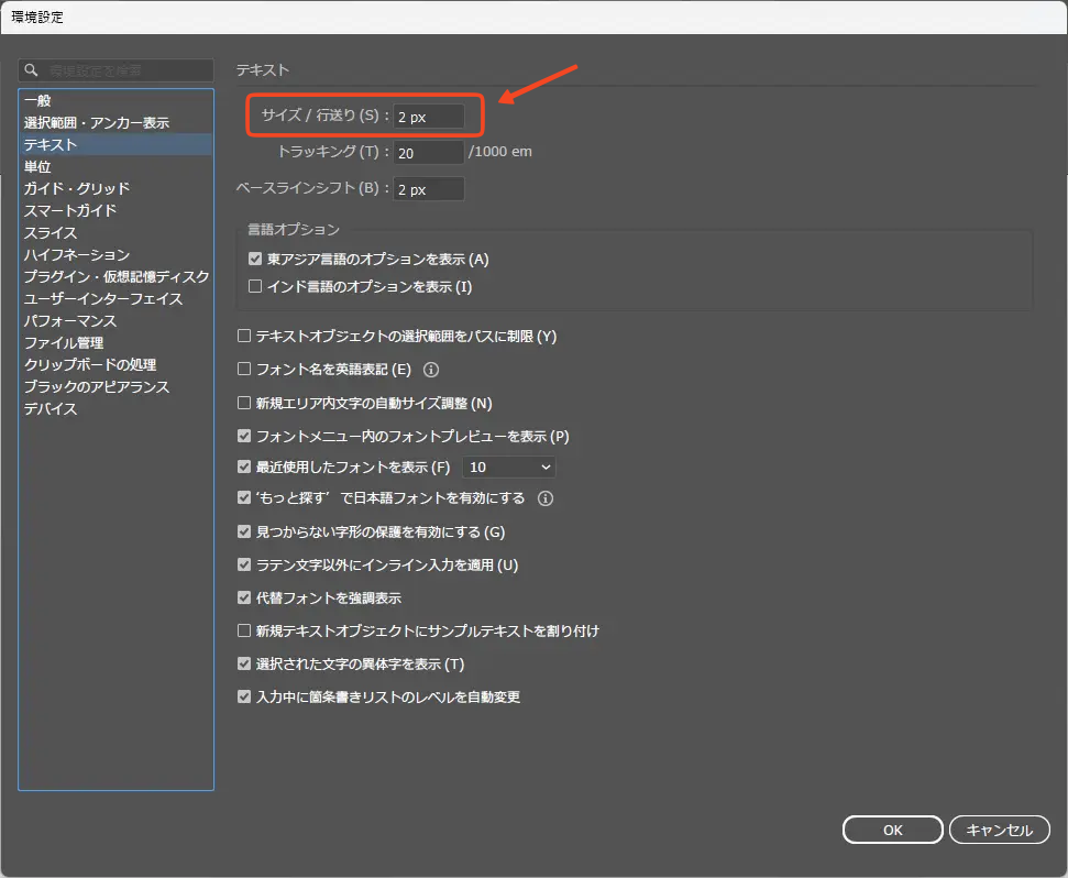次に「テキスト」タブにあるサイズ/行送りの設定です。