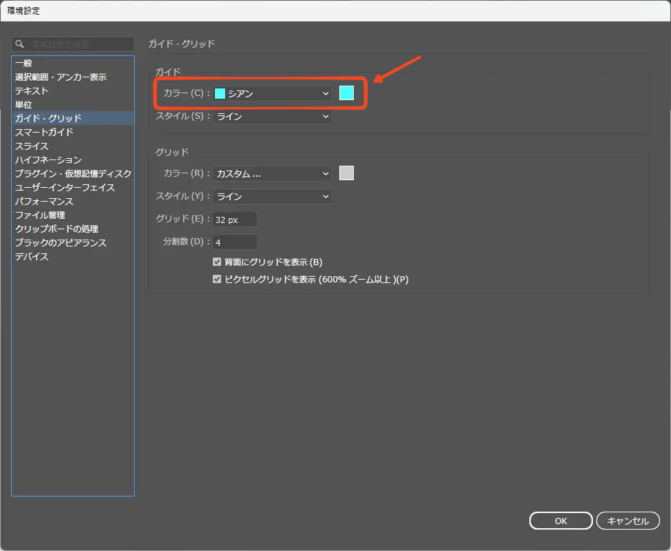 ・ガイドの色や表示方法