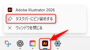 Illustratorをこれからよく使うってときは、タスクバー6にピン止めしておくと便利だよ