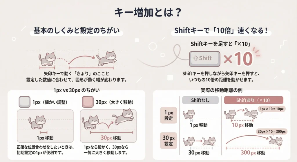 キー増加とは、キーボードの矢印キーを押したときに、オブジェクトがどれくらい動くかを決める設定です。