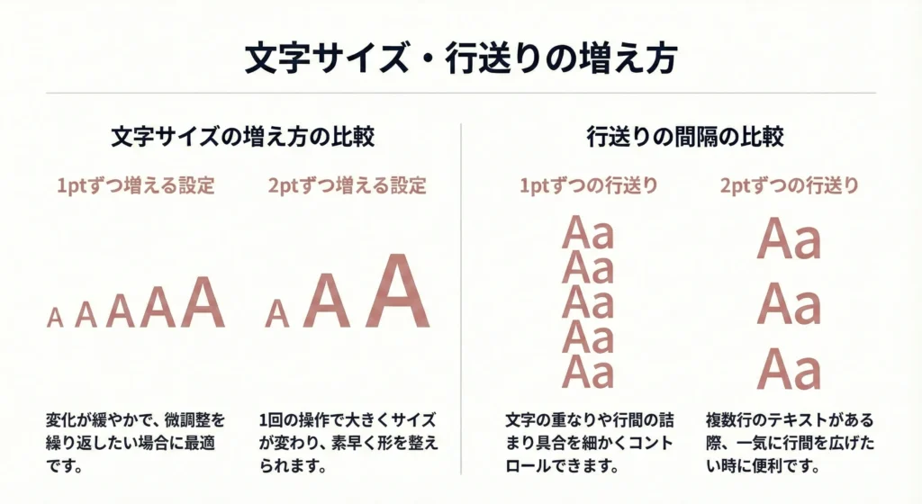 | テキスト:サイズ/行送り | 文字サイズ・行送りの増減単位 |