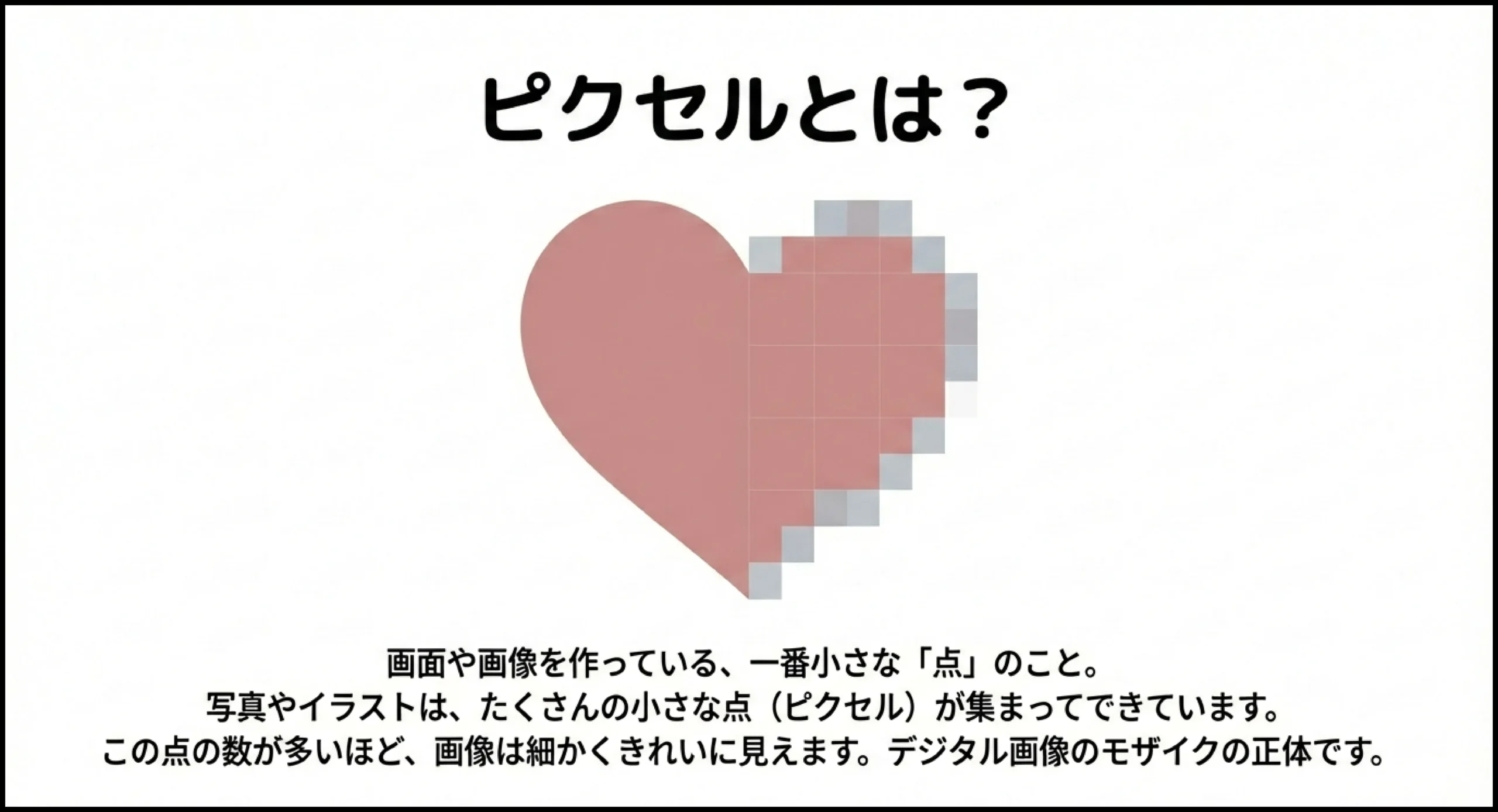 一方、ラスターデータは、色がついた小さな四角形(ピクセル3)をたくさん並べて画像を表現します。写真やイラストなどの画像データは、ラスターデータで表現されることが多いです。ラスターデータは、拡大すると画像がぼやけたり、画質が粗くなったりします。これは、画像がピクセルの集まりであるため、拡大するとピクセルが目立ってしまうからです。