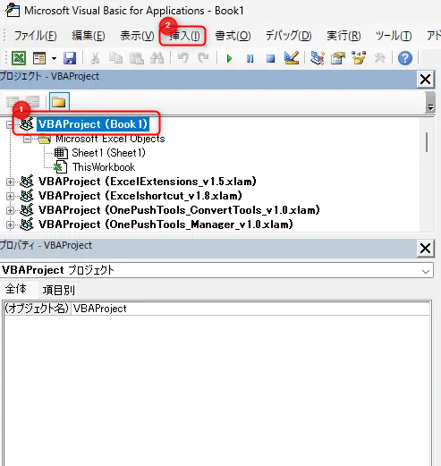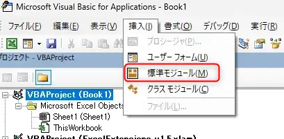VBAを追加したいブックを選択した状態で、挿入をクリックします