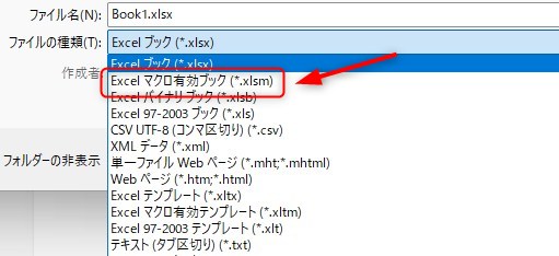 このとき、拡張子 .xlsx のままだと、せっかく作成したマクロが消えてしまいます。